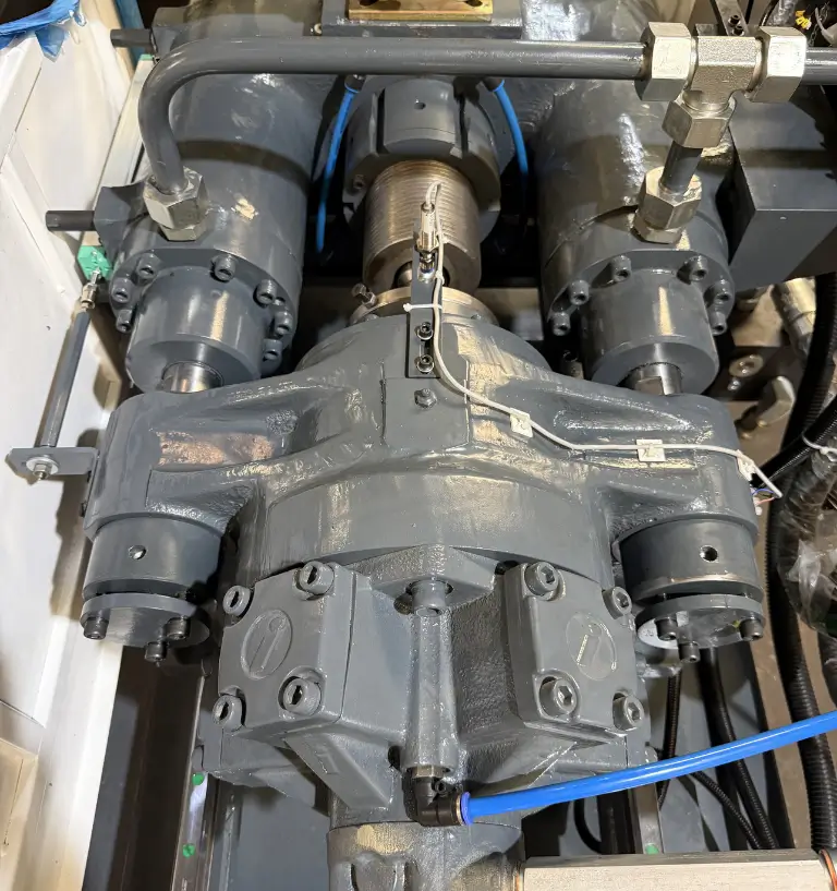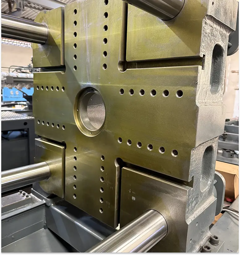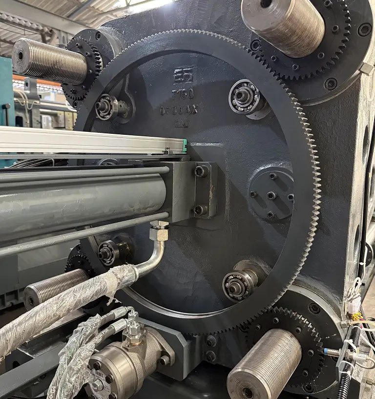A two-platen injection moulding machine features two large platens that are used for clamping the mould. This design offers several advantages such as space improved accessibility. The application of this machine is for medium or large-sized plastic parts moulding.